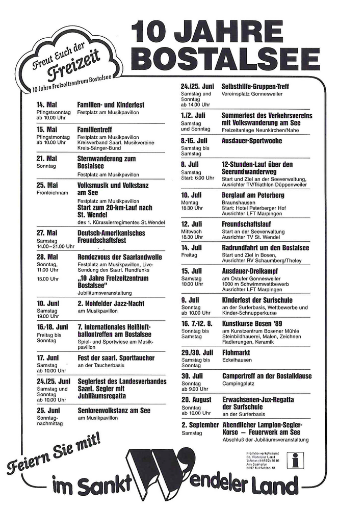 Somit wird der Bostalsee erst am 20. Mai 1979 offiziell eröffnet. Rund 40 Millionen DM kostet bis dahin das Großprojekt, großzügig durch Bund und Land gefördert. Doch gehen auch nach der offiziellen Eröffnung die Arbeiten weiter, investieren muss der Landkreis kontinuierlich – bis heute. Auch für die nahe Bosener Mühle, die der Landkreis erwirbt, bis 1989 1,3 Millionen DM aufbringt, um sie zu einem Kunstzentrum auszubauen, dessen Betrieb bereits 1977 ein Verein übernimmt und Kurse und Ausstellungen organisiert. Schließlich müssen See und Umgebung sowohl für Einheimische als auch Gäste attraktiv bleiben. Dazu gehören auch Veranstaltungen. Eine ganze Veranstaltungsserie führt der Landkreis zum zehnjährigen Jubiläum des Bostalsees 1989 durch, darunter ein Familien- und Kinderfest, ein Volkstanz am See, eine Jubiläumsregatta, ein Kunstmarkt und eine Lichterregatta mit Feuerwerk. Und immer wieder Werbemaßnahmen oder der Besuch von Messen, was in den Händen des Kreisverkehrsamtes liegt, das für das Jahr 1989 verkündet, der Bostalsee habe knapp 650.000 Besucher, das gesamte St. Wendeler Land über 63.000 Gästeankünfte und 244.000 Übernachtungen zu verzeichnen.